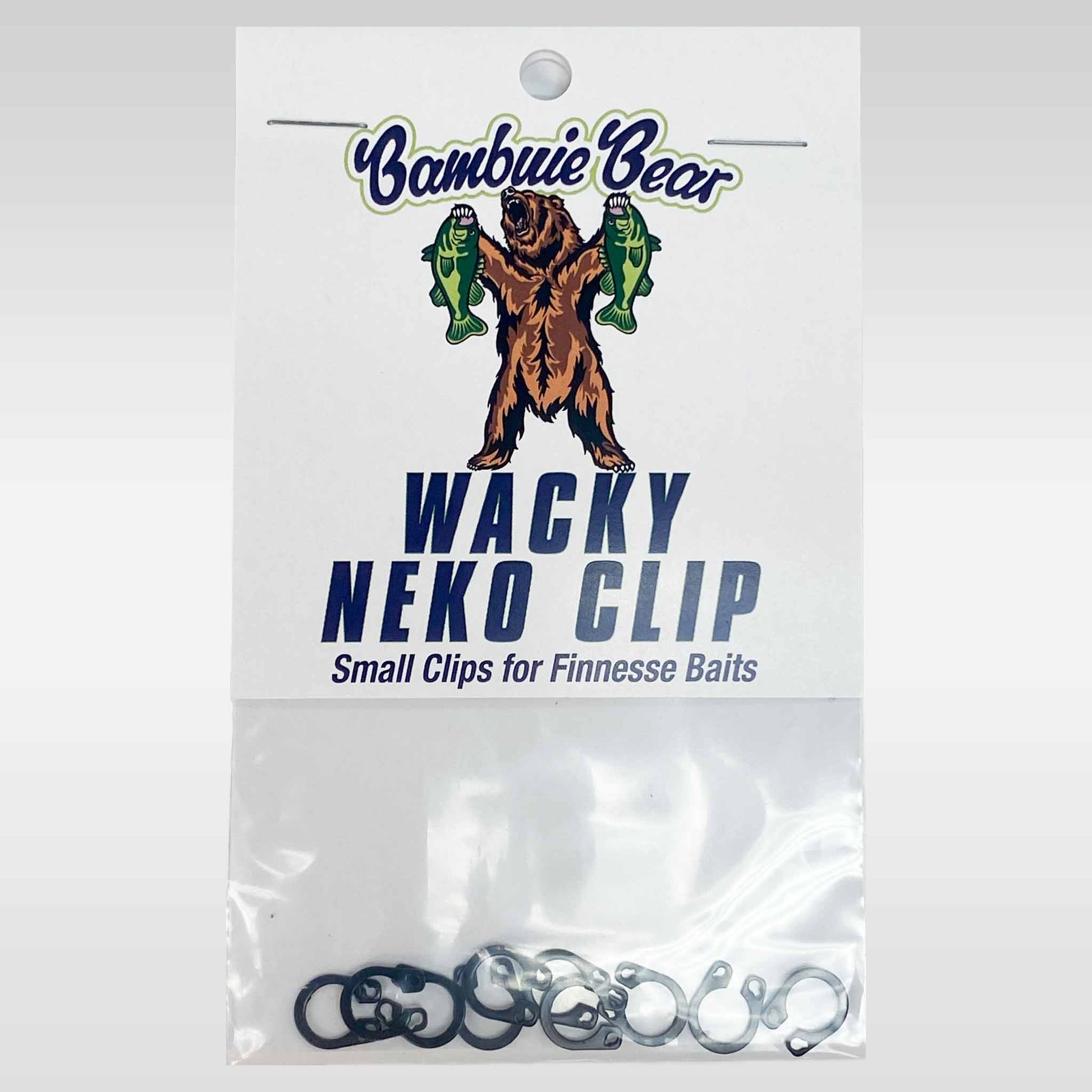 Each clip also features two different hook rigging holes to accommodate large and small diameter finesse hooks. Each hole has a slot for the hook barb to pass through without damaging the barb and ensuring a tight fit as well. Offered in multiple sizes that will fit most wacky-rig and neko-rig finesse soft plastics, the Bambuie Bear Wacky Neko Clips will replace all those rubber O-rings in your tackle box.